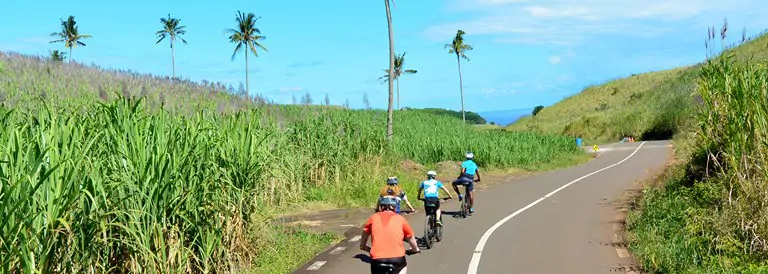 Dans la matinée, vous retrouverez Warren, votre guide, sur le parking de l'Aventure du Sucre. Après un moment d'échange et la prise en main de votre vélo électrique, vous quitterez les axes fréquentés pour emprunter des petits chemins serpentant entre les rangées de canne à sucre. Le parcours est accessible et agréable, l'assistance électrique rendant la balade confortable et sans effort. Au fil des kilomètres, les silhouettes du Pouce et du Pieter Both se dessinent à l'horizon et par endroits, les îles du nord pointent le bout de leur nez.